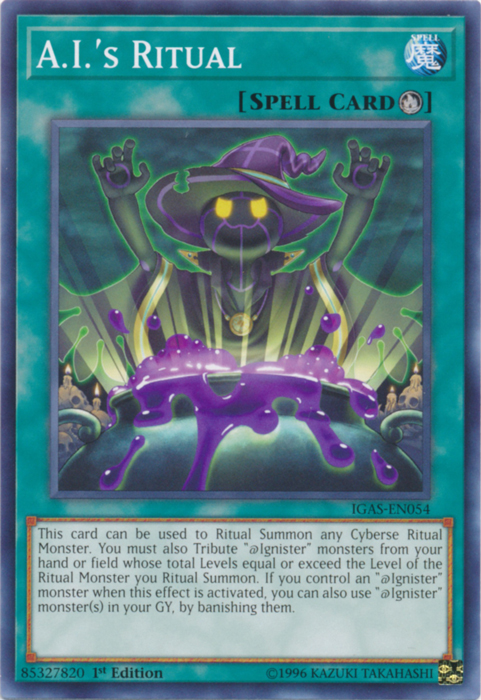 This card can be used to Ritual Summon any Cyberse Ritual Monster. You must also Tribute "@Ignister" monsters from your hand or field whose total Levels equal or exceed the Level of the Ritual Monster you Ritual Summon. If you control an "@Ignister" monster when this effect is activated, you can also use "@Ignister" monster(s) in your GY, by banishing them.