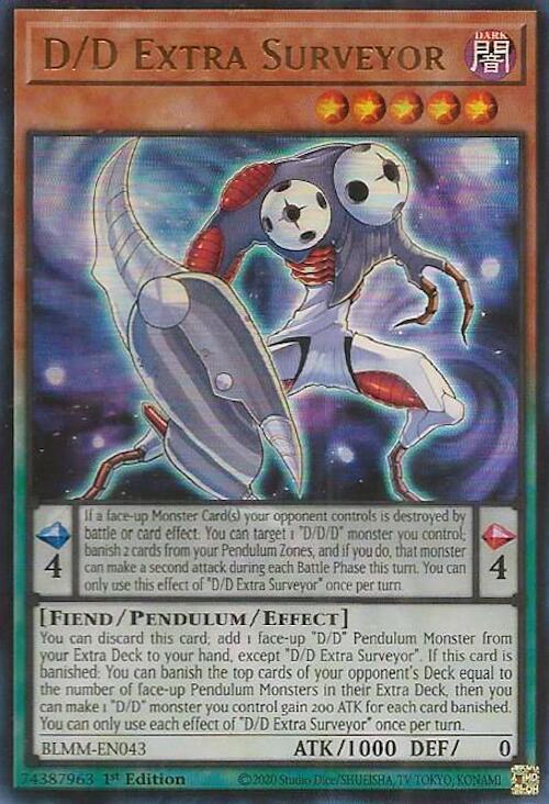 If a face-up Monster Card(s) your opponent controls is destroyed by battle or card effect: You can target 1 "D/D/D" monster you control; banish 2 cards from your Pendulum Zones, and if you do, that monster can make a second attack during each Battle Phase this turn. You can only use this effect of "D/D Extra Surveyor" once per turn.