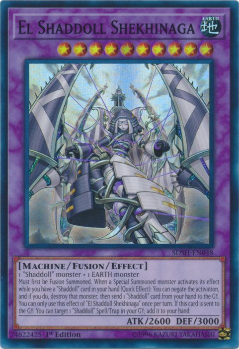 Must first be Fusion Summoned. During either player's turn, when a Special Summoned monster activates its effect while you have a "Shaddoll" card in your hand (Quick Effect): You can negate the activation, and if you do, destroy that monster, then send 1 "Shaddoll" card from your hand to the GY. You can only use this effect of "El Shaddoll Shekhinaga" once per turn. If this card is sent to the GY: You can target 1 "Shaddoll" Spell/Trap Card in your GY; add it to your hand.