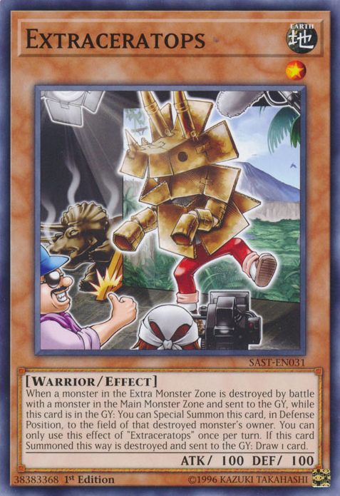 When a monster in the Extra Monster Zone is destroyed by battle with a monster in the Main Monster Zone and sent to the GY, while this card is in the GY: You can Special Summon this card, in Defense Position, to the field of that destroyed monster's owner. You can only use this effect of "Extraceratops" once per turn. If this card Summoned this way is destroyed and sent to the GY: Draw 1 card.
