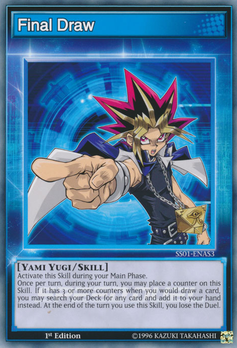 Once per turn, during your turn, you may place a counter on this Skill. If it has 3 or more counters when you would draw a card, you may search your Deck for any card and add it to your hand instead. At the end of the turn you use this Skill, you lose the Duel.