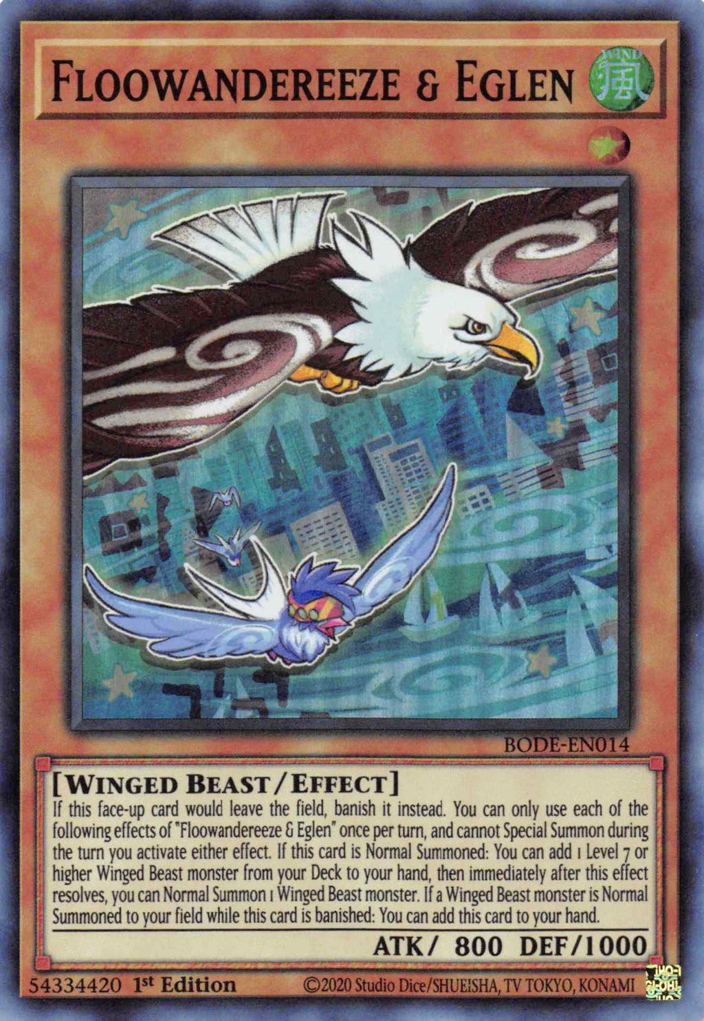If this face-up card would leave the field, banish it instead. You can only use each of the following effects of "Floowandereeze & Eglen" once per turn, and cannot Special Summon during the turn you activate either effect. If this card is Normal Summoned: You can add 1 Level 7 or higher Winged Beast monster from your Deck to your hand, then immediately after this effect resolves, you can Normal Summon 1 Winged Beast monster. If a Winged Beast monster is Normal Summoned to your field while this card is banished: You can add this card to your hand.