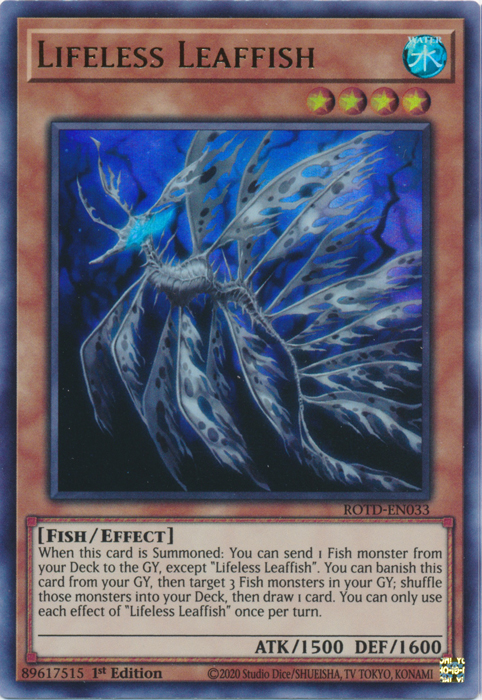 When this card is Summoned: You can send 1 Fish monster from your Deck to the GY, except "Lifeless Leaffish". You can banish this card from your GY, then target 3 Fish monsters in your GY; shuffle those monsters into your Deck, then draw 1 card. You can only use each effect of "Lifeless Leaffish" once per turn.