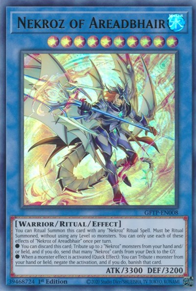 You can Ritual Summon this card with any "Nekroz" Ritual Spell. Must be Ritual Summoned, without using any Level 10 monsters. You can only use each of the following effects of "Nekroz of Areadbhair" once per turn. You can discard this card; Tribute up to 2 "Nekroz" monsters from your hand and/or field, and if you do, send the same number of "Nekroz" cards from your Deck to the GY. When a monster effect is activated (Quick Effect): You can Tribute 1 monster from your hand or field; negate the activation, and if you do, banish that card.