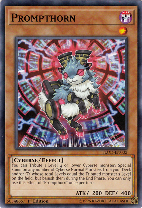 You can Tribute 1 Level 4 or lower Cyberse monster; Special Summon any number of Cyberse Normal Monsters from your Deck and/or GY whose total Levels equal the Tributed monster's Level on the field, but banish them during the End Phase. You can only use this effect of "Prompt Horn" once per turn.