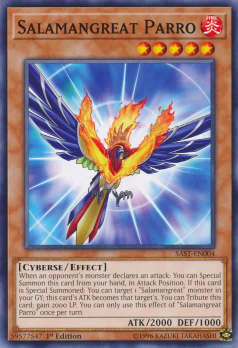 When an opponent's monster declares an attack: You can Special Summon this card from your hand, in Attack Position. If this card is Special Summoned: You can target 1 "Salamangreat" monster in your GY; this card's ATK becomes that target's. You can Tribute this card; gain 2000 LP. You can only use this effect of "Salamangreat Parro" once per turn.