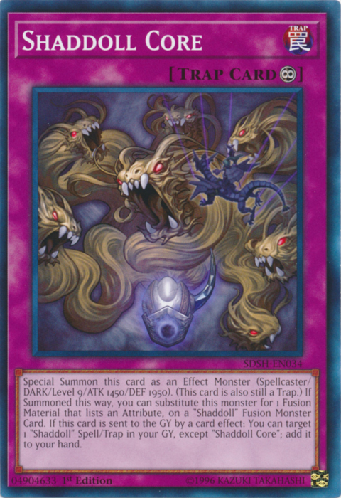 Special Summon this card as an Effect Monster (Spellcaster-Type/DARK/Level 9/ATK 1450/DEF 1950). (This card is also still a Trap Card.) If Summoned this way, you can substitute this monster for 1 Fusion Material that lists an Attribute, on a "Shaddoll" Fusion Monster Card. If this card is sent to the Graveyard by a card effect: You can target 1 "Shaddoll" Spell/Trap Card in your Graveyard, except "Shaddoll Core"; add it to your hand.