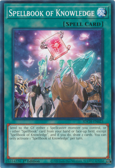 Send to the GY either 1 Spellcaster monster you control, or 1 other "Spellbook" card from your hand or face-up field, except "Spellbook of Knowledge", and if you do, draw 2 cards. You can only activate 1 "Spellbook of Knowledge" per turn.