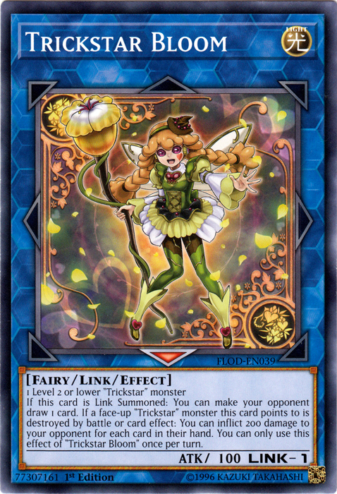 If this card is Link Summoned: You can make your opponent draw 1 card. If a face-up "Trickstar" monster this card points to is destroyed by battle or card effect: You can inflict 200 damage to your opponent for each card in their hand. You can only use this effect of "Trickstar Bloom" once per turn.