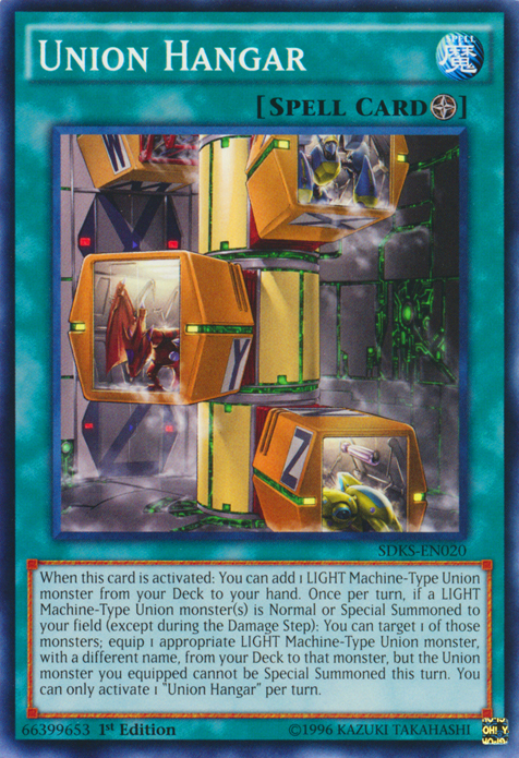 When this card is activated: You can add 1 LIGHT Machine-Type Union monster from your Deck to your hand. Once per turn, if a LIGHT Machine-Type Union monster(s) is Normal or Special Summoned to your field (except during the Damage Step): You can target 1 of those monsters; equip 1 appropriate LIGHT Machine-Type Union monster with a different name, from your Deck to that monster, but the Union monster you equipped cannot be Special Summoned this turn. You can only activate 1 "Union Hangar" per turn.
