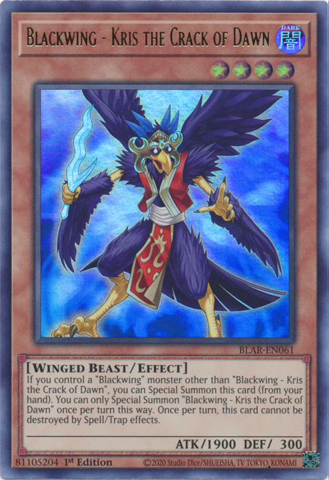 If you control a "Blackwing" monster other than "Blackwing - Kris the Crack of Dawn", you can Special Summon this card (from your hand). You can only Special Summon "Blackwing - Kris the Crack of Dawn" once per turn this way. Once per turn, this card cannot be destroyed by Spell/Trap effects.